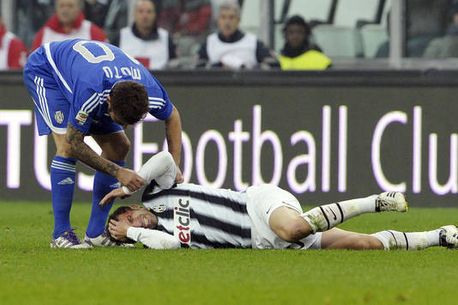 Alessandro Del Piero a suferit o accidentare groaznică în meciul de duminică, disputat împotriva Cesenei (2-0), spărgându-și capul după ce fundașul oaspeților, Marco Rossi, a aterizat cu crampoanele pe capul atacantului lui Juventus.