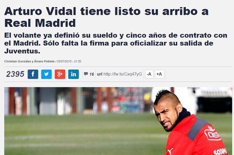 Conform sursei citate, o delegație a Realului s-a deplasat deja la Santiago de Chile, pentru a semna cu mijlocașul, după ce au obținut acordul board-ului din Torino pentru transfer. În măsura în care transferul se va materializa, Vidal va fi al doilea chilian care evoluează pentru gruparea de pe Bernabeu, după legendarul Ivan Zamorano.