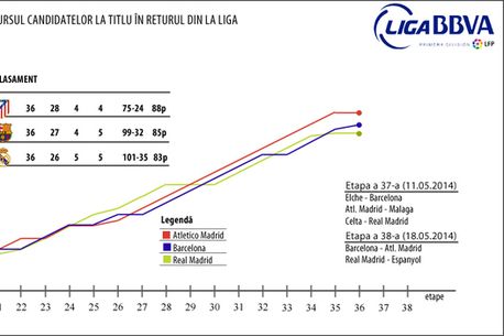 21:48 În lupta pentru titlu, calculele sunt clare. Cum Atletico e la 3 puncte în fața Barcelonei, catalanii trebuie să câștige meciul direct  care va avea loc sâmbăta viitoare, de la ora 19:00. Principalul criteriu de departajare în caz de egalitate de puncte este rezultatul meciurilor directe, ceea ce înseamnă că singura șansă ca Barcelona să ia titlul e să o învingă pe Atletico, după ce în tur scorul a fost egal, 0-0. Însă Barca nu a reușit nicio victorie în fața echipei lui Simeone în cinci dueluri directe în acest sezon.