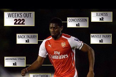 În mod șocant, Diaby a suferit până în prezent 42 de accidentări, care l-au forțat să stea pe bară mai bine de 222 de săptămâni, adică peste 55 de luni. Practic, din cei 9 ani petrecuți de Diaby la Arsenal, mijlocașul a fost indisponibil în aproape jumătate din timp.