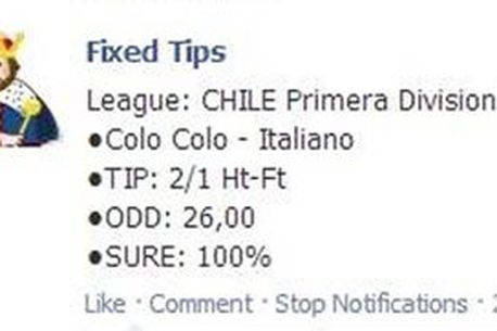 Un meci din prima ligă din Chile le-a făcut mai senin multor pariori începutul de an 2014. Partida dintre Colo Colo și Audax Italiano (2-1) a fost unul dintre jocurile vehiculate pe paginile tipsterilor ca fiind un posibil aranjament de tip „2 pauză / 1 final”. Cota a fost și ea una extrem de atractivă pentru pariori, aceștia putând să își înmulțească de până la 26 de ori suma mizată.