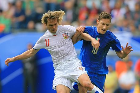 Nedved (stânga), în duel cu Totti într-o confruntare din cadrul grupelor Campionatul Mondial din 2006 (Cehia – Italia 0-2)