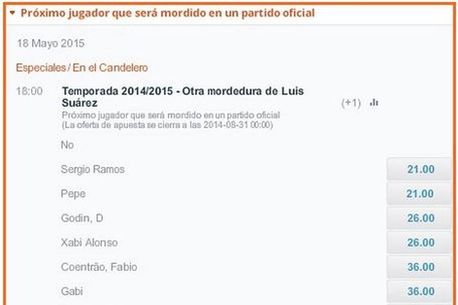 După victimele Bakkal, Ivanovic și Chiellini și după transferul său la Barcelona, multă lume se întreabă pe cine va mușca Luis Suarez în La Liga. O casă de pariuri din Spania a afișat deja cotele pentru următoarele posibile victime ale uruguayanului. Conform bookmakerilor, cei mai expuși par a fi fundașii centrali ai lui Real Madrid, Sergio Ramos și Pepe, cu o cotă de 21. Aceștia sunt urmați de Diego Godin, de la Atletico, și de mijlocașul Xabi Alonso, de la Real, cu o cotă de 26.