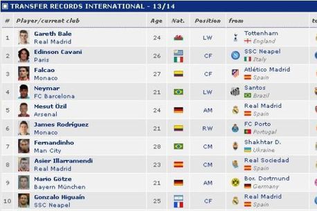 Ca o comparație cu ce se întâmpla cu zece ani în urmă cel mai scump transfer din sezonul 2003-2004 era trecerea lui David Beckham de la Manchester United la Real Madrid pentru 37,5 milioane de euro. Acum, în sezonul 2013-2014 ultimul transfer din TOP 10 cele mai scumpe mutări este achiziționarea lui Higuain de către Napoli pentru 37 de milioane.