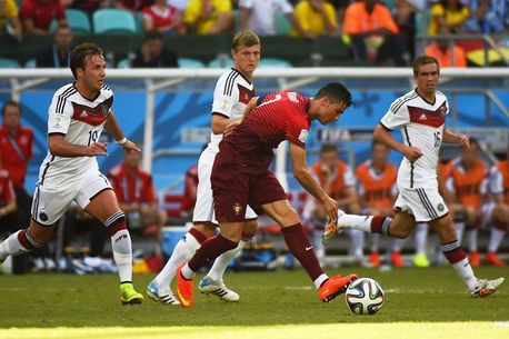 Cristiano Ronaldo (centru), înconjurat de trei campioni mondiali nominalizați pentru Balonul de Aur: Mario Gotze (stânga), Toni Kroos (centru – plan secundar) și Phillip Lahm (dreapta). FOTO: AFP
