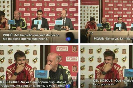 Ce s-a întâmplat, însă, joi seară? O conferință de presă banală a naționalei Spaniei, care a avut loc la Washington, a confirmat practic transferul lui Fabregas la o altă echipă. Concret, camerele televiziunii spaniole TVE au surprins o discuție între Gerard Pique și Vicente del Bosque, care nu erau conștienți că microfoanele au fost deschise. „Trebuie să îl apărăm pe Cesc în această conferință, mi-a spus că pleacă de la Barcelona pentru 33 de milioane de euro”, i-a transmis Pique selecționerului Spaniei, care a replicat cu o înjurătură comună în spaniolă, menită să destindă atmosfera. Ceea ce e interesant e că discuția off the record nu a fost confirmată în discuțiile directe cu presa, Pique spunând că Fabregas nu pleacă nicăieri. Mai mult, ceea ce a dat de bănuit e mimica fețelor lui Pique și del Bosque, una destul de amuzată, ceea ce poate da de crezut că totul a fost o glumă regizată pentru a păcăli mass-media spaniolă.