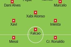 Casillas – Dani Alves, Pique, Sergio Ramos, Marcelo – Xabi Alonso, Xavi, Iniesta – Messi, Falcao, Cristiano Ronaldo