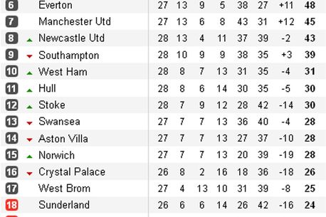 Surpriza zilei s-a consumat pe Britannia Stadium, acolo unde Stoke a învins Arsenal cu 1-0, prin golul marcat de Walters, din penalty. În urma acestui rezultat, echipa antrenată de Arsene Wenger a pierdut locul secund în detrimentul lui Liverpool, care a învins cu 3-0 la Southampton.