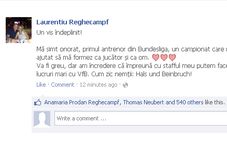 Soția lui Reghecampf a postat știrea din ProSport și pe pagina ei de Facebook. A primit 29 de like-uri și două comentarii: „Baftă” și „April, april”. Al doilea mesaj este dat chiar de preparatorul fizic, Thomas Neubert.