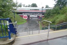 Cam așa arată intrarea în pasajul suporterilor, văzută dinspre stadion. „Pentru totdeauna devotat” este mesajul pe care-l transmit suporterii lui Eintracht. Foto: Octavian Vasilescu