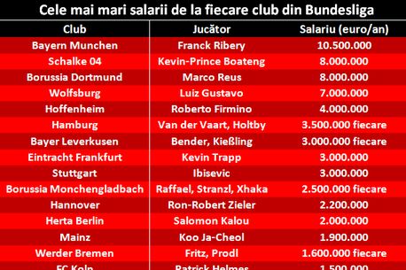 Stadioane pline, multe goluri înscrise și echipe care joacă un fotbal deschis. Acestea sunt doar câteva dintre motivele pentru care Bundesliga este considerată una dintre cele mai atractive competiții de fotbal din Europa. Un alt motiv este existența unor jucători talentați în componența ligii, jucători care sunt răsplătiți pe măsură, după cum se poate observa și mai jos, din clasamentul celor mai mari salarii oferite de fiecare dintre cele 18 cluburi din Bundesliga.