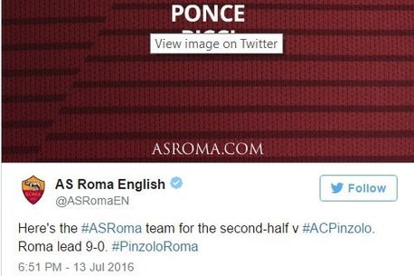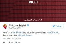 Golurile romanilor au venit pe bandă rulantă în fața mult mai slab cotaților fotbaliști de la Pinzolo. Pe lista marcatorilot s-au regăsit: Edin Dzeko (4 goluri), Mohammed Salah (2 goluri), Iturbe (2 goluri), Ricci (2 goluri), D”Urso, Torosidis, Perotti, Gerson, Ponce, Di Livio. Scorul la pauză a fost 9-0.