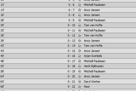 În repriza a doua, s-a făcut 24-0 până în minutul 71, după care fotbaliștii antrenați de Darije KaleziÇ au scăzut mult ritmul. Au mai marcat o dată prin Rutjes, în minutul 85, iar pe final adversarii au completat rușinea cu un autogol.