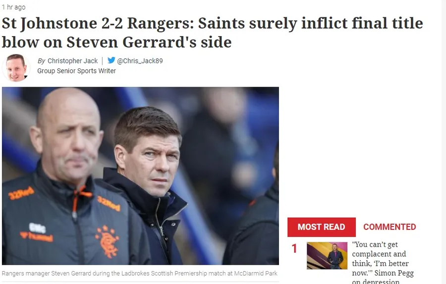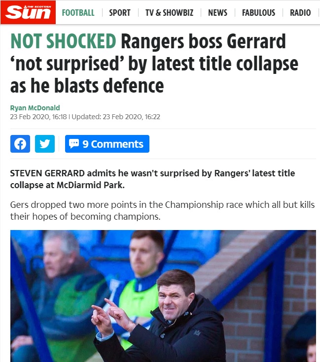 „Gerrard nu este surprins de ultimul colaps în lupta pentru titlu”, scrie sursa citată. Și Herald Scotland insistă pe vina antrenorului. „Echipa lui Steven Gerrard este ieșită din ecuația titlului”