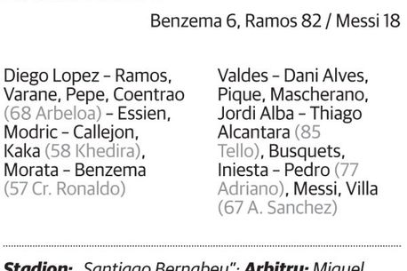 E deja clar că Barcelona trece prin cele mai grele momente din ultimii cinci ani. Eliminați din semifinalele Cupei de Real Madrid marțea trecută, după un 3-1 umilitor încasat chiar pe „Camp Nou”, catalanii s-au deplasat sâmbătă pe „Bernabeu” pentru a-și lua revanșa. Dar o echipă cu Callejon, Morata sau Kaka printre titulari a învins cu 2-1, în ciuda unui gol marcat de Messi, al 18-lea împotriva Realului, prin care argentinianul a egalat recordul absolut de reușite în „Clasice”, deținut de Alfredo di Stefano.