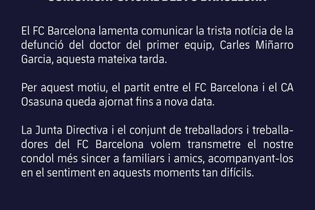 „FC Barcelona regretă să anunţe vestea tristă a decesului medicului primei echipe, Carles Miñarro Garcia, în această sâmbătă după-amiază.