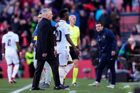 Carlo Ancelotti head coach of Real Madrid and Vinicius Junior left winger of Real Madrid and Brazil during the LaLiga Santander match between RCD Mallorca and Real Madrid CF at Visit Mallorca Estadi on February 5, 2023 in Mallorca, Spain. RCD Mallorca v Real Madrid CF - LaLiga Santander, Spain - 05 Feb 2023,Image: 754218378, License: Rights-managed, Restrictions: RESTRICTED TO EDITORIAL USE, Model Release: no