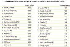 Cu investiții de 750 de milioane de euro, Real Madrid conduce clasamentul cluburilor care au cheltuit cei mai mulți bani pe transferuri între 2008 și 2014. În schimb, cluburile din Anglia sunt cele care domină în clasamentul realizat de CIES. Din cele 40 de cluburi prezente, 15 provin din Premier League. Adunate, investițiile realizate de acestea în perioada 2008-2014 ajung la astronomica sumă de 3,85 de miliarde de euro. În locul secund se află Italia (9 cluburi) cu suma de 2,36 miliarde de euro, în timp ce următoarele trei poziții sunt ocupate de Spania (6 cluburi, 2,02 miliarde de euro), Franța (4 cluburi, 1,05 miliarde de euro) și Germania (6 cluburi, 976 milioane de euro).