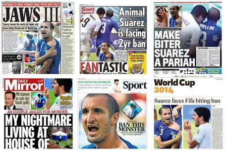 În cazul în care are din nou nevoie de un pretext pentru a-și justifica plecarea din Anglia, Suarez nu trebuie decât să posteze această imagine pe o rețea de socializare. Totuși, ar fi doar un pretext. Nu toată mass media britanică a reacționat ca și cum gestul lui Suarez este un prilej perfect de răzbunare. „Suarez are nevoie de ajutor psihiatric, nu de o pedeapsă cu închisoarea. El merita să fie sancționat, ideal pe toată durata Cupei Mondiale, plus o pedeapsă suplimentară care să fi rămas cu suspendare, cu condiția să primească tratament de specialitate”, a scris Glenn Moore în The Independent, imediat după suspendarea uruguayanului.