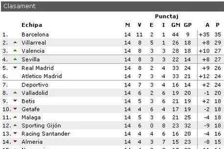 Real Madrid va întâlni săptămâna viitoare FC Barcelona, în derby-ul campionatului, catalanii fiind neînvinși de 13 etape. Iată rezultatele ultimei etape și clasamentul la zi al Primerei Division:
