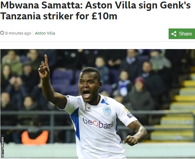 BBC Sport anunță că Aston Villa a bătut palma cu Genk pentru transferul tanzanianului de 27 de ani Mbwana Samatta. Atacantul a semnat un contract cu echipa din Birmingham pentru patru ani și jumătate.