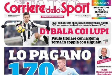 Cel mai bine cotat jucător din lotul lui Lazio, Milinkovic-Savic (22 de ani, 30 de milioane de euro), a ținut prima pagină, vineri, în Corriere dello Sport. Italienii susțin că PSG e gata să ofere 170 de milioane pentru transferul mijlocașului sârb, care traversează un sezon impresionant. Juventus și Manchester United sunt de asemenea interesate de colegul lui Ștefan Radu. FCSB va juca contra lui Lazio în 16-imile Ligii Europa, în februarie.