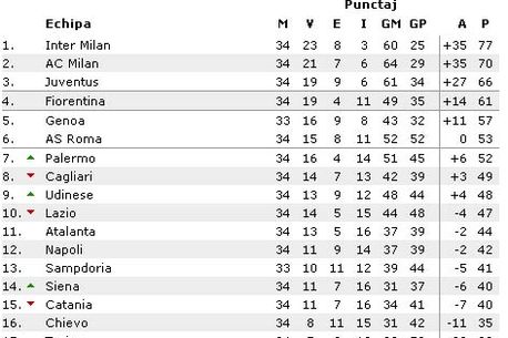 Rezultate înregistrate în partidele disputate, duminică, în etapa a XXXIV-a campionatului Italiei.