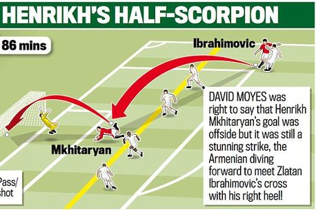 Fostul mijlocaș de la Borussia Dortmund a înscris al treilea gol al echipei sale, printr-un artificiu tehnic rar întâlnit pe terenul de fotbal. Printr-un gest acrobatic asemănător cu „coregrafiile” columbianului Rene Higuita, Mkhitaryan a marcat cu călcâiul, după o pasă trimisă de pe aripa dreaptă de suedezul Zlatan Ibrahimovic. „Lovitura Scorpionului” a fost caracaterizată de antrenorul lui United, Jose Mourinho, drept o „execuție fenomenală”. Armeanul a explicat: „Mă așteptam ca pasa să vină mai în față, dar nu am avut ce să fac și unica soluție a fost să lovesc mingea cu călcâiul. Într-o fracțiune de secundă m-am uitat la asistent de teamă să nu fi fost în ofsaid și imediat am început să sărbătoresc. A fost magie pură de Crăciun, cel mai frumos gol din carieră”, a spus pentru Daily Mail fostul jucător antrenat de Mircea Lucescu la Șahtior.