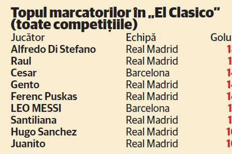 Ultima reușită a lui Messi în fața marilor rivali datează din returul Supercupei din sezonul trecut, când a marcat pe final golul decisiv (3-2, după 2-2 în tur). În topul marcatorilor all-time din „El Clasico”, atacantul argentinian e pe locul 6, la cinci goluri de liderul Di Stefano. Astăzi are șansa să-și mărească zestrea. Mai ales că nu va mai avea lângă el „umbra” Pepe.