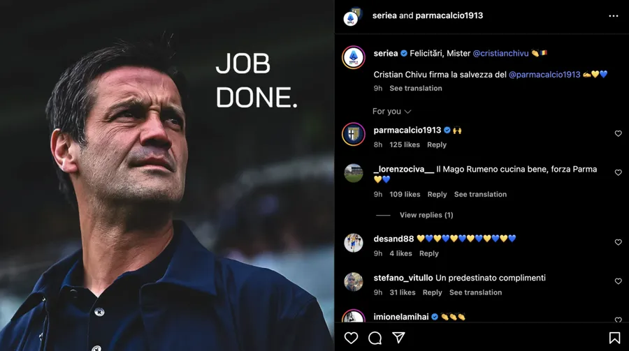 Magicianul român gătește bine, hai Parma”, „Un mesaj de felicitări predestinat”, „Eroul”, „Demonul meu”, „Dacă Chivu ar fi jucat doar împotriva echipelor mari din Serie A ar fi câștigat titlul”, „Ce revenire din partea Parmei!”, „Nu aș fi dat un euro pe el, dar a făcut o treabă extraordinară. O echipă solidă și de cele mai multe ori agresivă”, sunt doar câteva din comentariile scrise la postarea de mai sus.