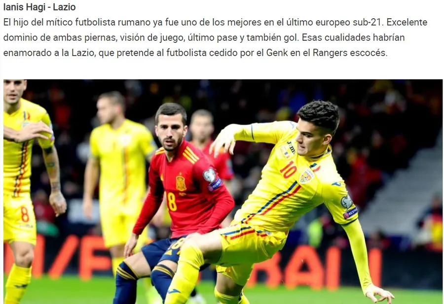 ”Fiul legendarului fotbalist român a fost printre cei mai buni jucători de la Campionatul European U21 din Italia şi San Marino. Jucător excelent cu ambele picioare, fotbalist cu viziune de joc, cu pasă decisvă şi cu gol, Ianis Hagi i-a făcut pe cei de la Lazio să se îndrăgostească de el. Italienii pretind transferul său de la Genk, deşi Ianis Hagi este acum împrumutat la Rangers” scrie publicaţia spaniolă.