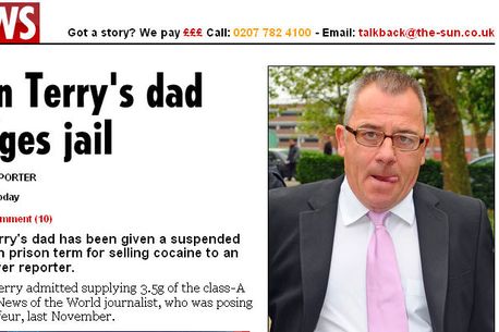 John Terry este zguduit de încă o veste proastă, chiar înainte de începerea Mondialului. După ce a pierdut banderola de căpitan al Angliei în urma aventurii avute cu logodnica lui Wayne Bridge, Vanessa Perroncel, Terry este zguduit de o nouă știre: tatăl său a fost condamnat, azi, la șase luni de închisoare cu suspendare pentru trafic de droguri, de către un tribunal din sud-estul Angliei. Edward Terry, în vârstă de 56 de ani, a recunoscut că i-a furnizat cocaină unui jurnalist de la tabloidul britanic News of the World, care era sub acoperire. Incidentul a avut loc în noiembrie 2009 într-un bar de vinuri din Chafford Hundred (estul Londrei).