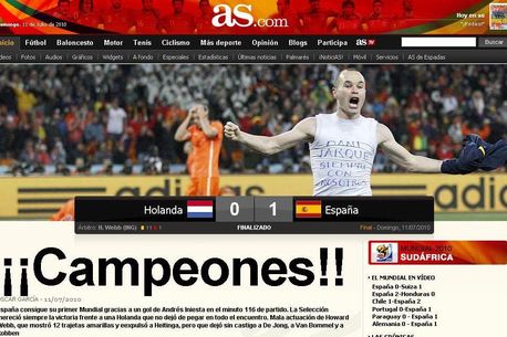 Spaniei a câștigat Cupa Mondială, după ce a învins Olanda după prelungiri, scor 1-0 (0-0), în finala competiției din Africa de Sud, disputată, duminică seară, la Johannesburg, Unicul gol al întâlnirii a fost marcat de Andres Iniesta, în minutul 117. Mijlocașul Barcelonei a fost desemnat și cel mai bun jucător al partidei. "Iniesta ne duce în Rai", au titrat cei de la Marca, imediat după ce elevii lui Del Bosque au câștigat Cupa Mondială. "Suntem campioni mondiali! Spania și-a câștigat un loc în Pantheonul fotbalului, după ce a învins Olanda în prelungirile finalei din Africa de Sud. Meciul a fost frumos, în ciuda arbitrajului slab. Am suferit, dar a meritat", au mai scris cei de la Marca.