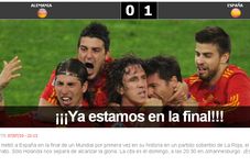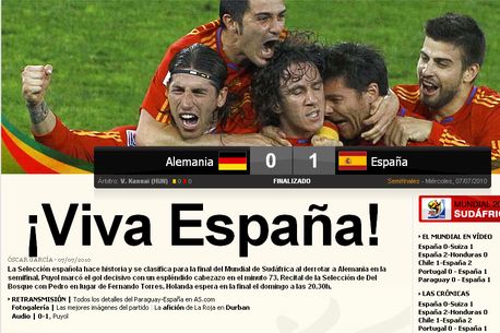 Spania a reușit să se califice în finala Campionatului Mondial. Ibericii au trecut la limită de o Germanie ce părea invicibilă, scor 1-0, la capătul unui meci pe care l-au controlat de la un capăt la altul. Performanța echipei lui Del Bosque a declanșat sărbătoarea în Spania. Ziarele As și Marca se întrec în superlative la adresa naționalei "La Roja "Spaniolii au păstrat cel ma frumos fotbal pentru semifinale, exact când trebuie cel mai mult. Am fost superiori Germaniei și victoria este meritată. Nu e un vis. Pentru prima oară în istorie, Spania joacă finala unui Campionat Mondiale", scrie Marca, care titrează: "Suntem în finală" Concurenșii de la As titrează: "Viva Spania": "Naționale scrie istorie și se califică în finala Cup