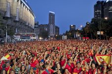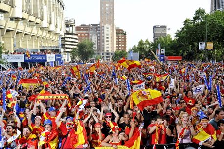 Zeci de mii de suporteri îmbrăcați în tricoul Spaniei s-au îndreptat, duminică, spre centrul Madridului, unde au fost instalate mai multe ecrane uriașe pentru finala Cupei Mondiale cu Olanda. Organizatorii așteaptă peste 200.000 de spectatori în fața ecranelor uriașe plasate în piețele Colon și Cibeles și pe strada Recoletos, în centrul capitalei. Printre acești fani, numeroși tineri purtau drapelul spaniol sau replici ale Cupei Mondiale pe care Spania speră să o câștige pentru prima oară în istoria sa.