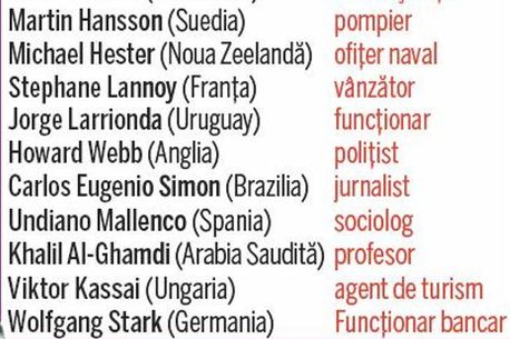 FIFA a definitivat lista cu cei 30 de arbitri care vor oficia la Cupa Mondială din Africa de Sud. Cum era de așteptat, printre ei nu se află niciun român, însă sunt reprezentate țări precum Guatemala, Seychelles și El Salvador. Ar putea fi trași mijlocașii stânga pe dreapta la turneul final care va începe pe 11 iunie? Dacă ideea nu le va veni selecționerilor, acest lucru l-ar putea face arbitrul Howard Webb. Și nu pentru că englezul s-ar băga peste planurile tactice ale acestora, ci din cauza defectului său profesional. Webb, unul dintre cei 30 de „fluierași" care vor împărți dreptatea în Africa de Sud este de meserie polițist. Messi, Cristiano Ronaldo și celelalte vedete se vor întâlni pe teren și cu profesori, vânzători sau pompieri. Dintre toți cei aleși de FIFA, doar Eddy Maillet, din Seychelles, și Yuichi Nishimura, din Japonia, sunt la bază arbitri.