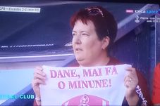 Aceștia i-au încurajat în mai multe rânduri pe fotbaliștii alb-vișinii, iar o fană a avut un mesaj neașteptat pentru antrenorul Dan Petrescu. Ea a afișat o bucată de pânză imprimată cu mesajul „Dane, mai fă o minune!”, alături de emblema campioanei României.
