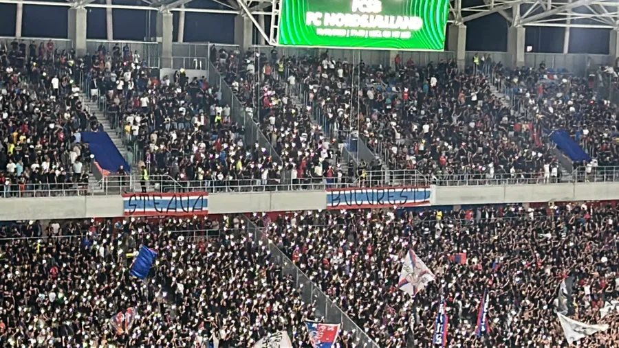 Lupta pentru identitate dintre FCSB și CSA Steaua a continuat și la meciul cu Nordsjaelland din Conference League. Fanii vicecampioanei României au afișat două bannere uriașe care au compus mesajul „Steaua București”, în Peluza Nord a stadionului din Sectorul 6 al Capitalei.