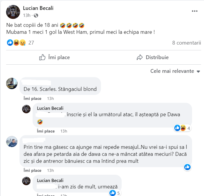 Pe lângă mesajele de genul „Dawa-Degea-ba!” și „Dawa – Steaua 2-0”, Lucian Becali a mai scos în evidență și faptul că pe FCSB o bate o echipă care a folosit jucători de 18 ani. „Ne bat copiii de 18 ani. Mubama 1 meci 1 gol la West Ham, primul meci la echipă mare!”.