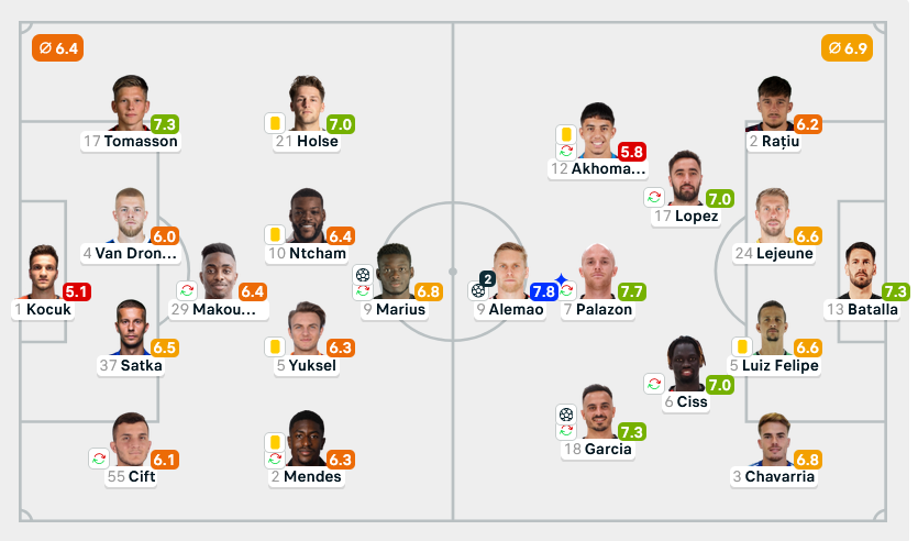 Omul meciului a ieșit, așa cum era normal, atacantul central Alemao, notat cu 7.8, în timp ce media calificativelor primite de Rayo a fost 6.9.