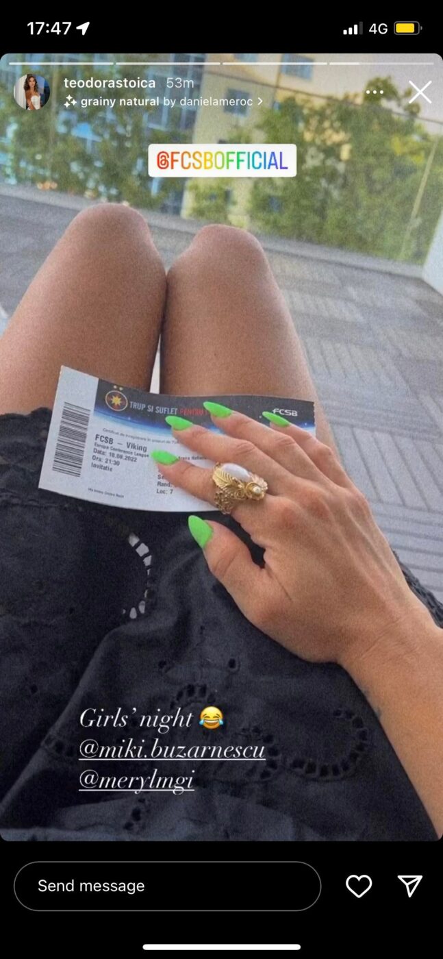 Anunțul a fost făcut de fata managerului general de la FCSB printr-o postare pe Instagram, unde a surprins tichetul de acces la jocul din această seară, alături de textul: „Seara fetelor”, menționându-le și pe prietenele sale.