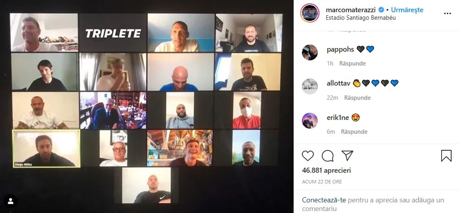 Trebuia să fie o mică petrecere, dar pandemia de COVID-19 a dat planul peste cap. Și totuși câțiva dintre cei care au luptat în finala cu Bayern Munchen „s-au întâlnit” cu ajutorul aplicației Zoom. Cristi Chivu, Julio Cesar, Milito, Sneijder, Maicon, Zanetti, Samuel, Cordoba și Materazzi au stat de vorbă cu patronul Massimo Moratti și cu antrenorul Jose Mourinho. Materazzi a fost cel care a făcut o fotografie și a postat-o pe „Instagram”.