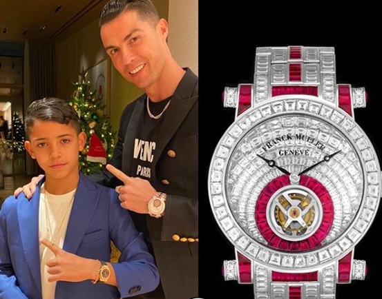 În ultima fotografie pe care au postat-o pe internet, cei doi Ronaldo poartă ceasuri scumpe. Cristiano junior se mândrește cu o bijuterie de 15.000 de euro, cu un cadran din aur roz. Tatăl său are un ceas din gama Tourbillon, pe care apare semnătura celebrei case de lux elvețiene Franck Muller. Are smaralde și 42 de diamante și este evaluat la 1.500.000 de euro.