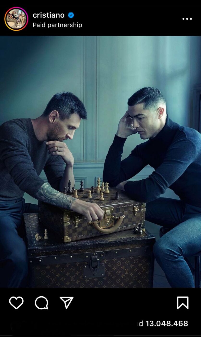 În poza care a strâns aproximativ 25 de milioane de aprecieri, Cristiano Ronaldo și Lionel Messi apar în timpul unui joc de șah, imaginea fiind reclama celebrului brand Louis Vuitton. Postarea portughezului a adunat 13 milioane de like-uri, în timp fotografia postată de jucătorul celor de la PSG a primit nu mai puțin de 12 milioane.