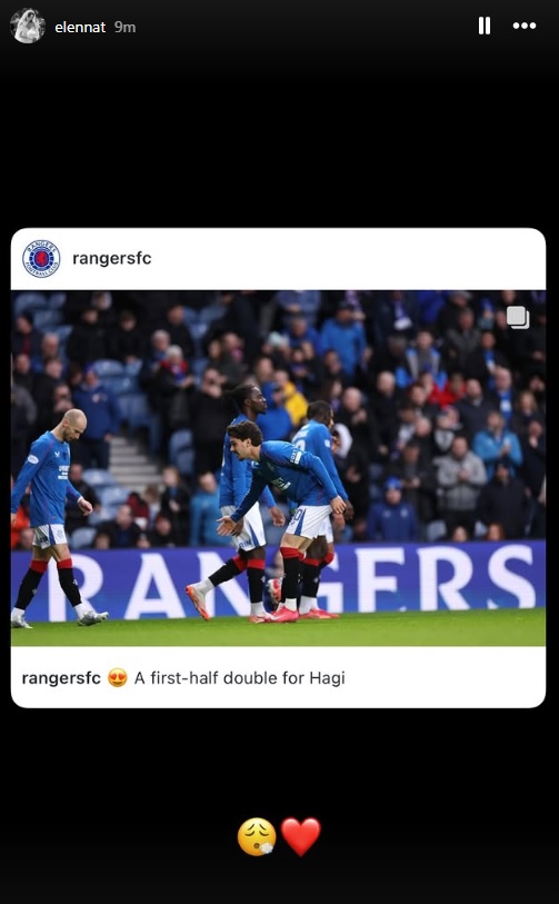 Prin intermediul unei postări pe care a realizat-o pe pagina ei de Instagram, la Insta Story, soția lui Ianis Hagi a distribuit o imagine împrăștiată pe internet de Rangers. În poza respectivă, Hagi Jr. face renumita plecăciune în fața suporterilor lui Rangers, modalitate prin care el alege deseori să își celebreze reușitele.