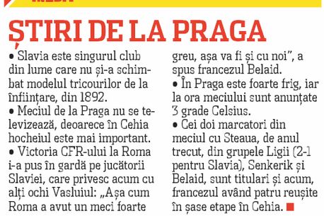 Viorel Hizo a urmărit cu atenție în ultimele zile evoluția Slaviei Praga, adversarul din turul I al cupei UEFA. „Au o echipă de mare forță. Media de înălțime este peste 1,80 metri. Au jucători masivi care pun probleme la fazele fixe. L-am trimis și pe secundul meu, Cristi Dulca, la un meci oficial pentru a-i urmări la lucru pe viu. Vom trage linie și vom vedea care va fi tactica de joc cea mai bună pentru partida tur", a spus tehnicianul.