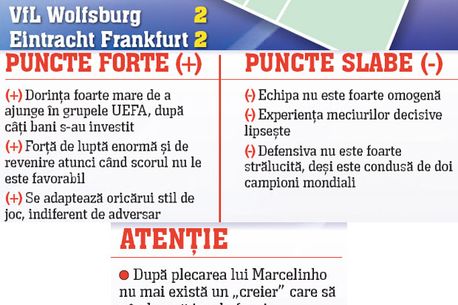 Vlad Munteanu, jucătorul „lupilor”, nefolosit de tehnicianul Felix Magath în partida din weekend, a declarat pentru ProSport că echipa sa nu greșește de obicei atât de rău în defensivă precum s-a întâmplat cu Eintracht. „Cel puțin la primul gol al lor am greșit în apărare destul de rău și pot spune că le-am făcut cadou reușita prin care au deschis scorul”, ne-a spus Vlad. Mijlocașul român ne-a dezvăluit apoi că cei de la Wolfsburg au o forță ofensivă mare.