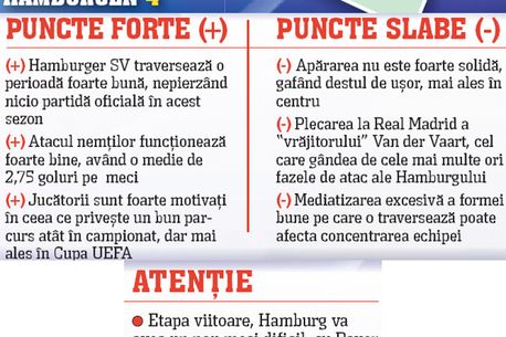 Legat de punctele slabe ale germanilor, directorul sportiv al Unirii a făcut următoarea remarcă: „Hamburg primește foarte ușor goluri. Are probleme în defensivă și cred că o echipă foarte bine organizată și inteligentă poate să o surprindă”.