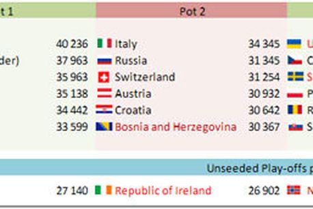 Cehia (Poate urca în urna 2) și Turcia (poate urca în Urna 3)  vor trebui să aștepte disputarea play-off-ului pentru a afla în ce urne vor fi.