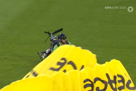 ? close call… #Greenpeace protestor gets tangled in aerial cam while landing at #Euro2020. pic.twitter.com/XsWYeYkyaE